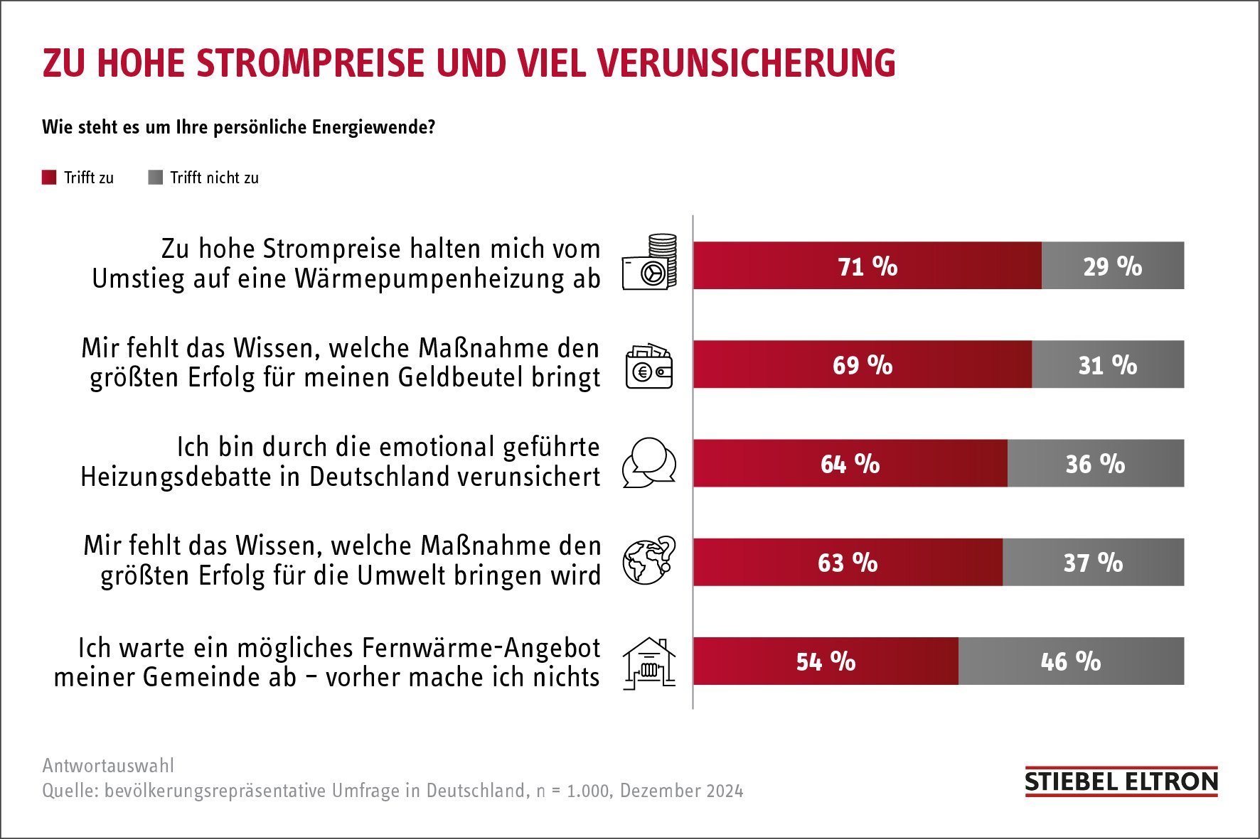 „Eine solche Strompreissenkung ist natürlich ein wichtiges Signal an die Verbraucherinnen und Verbraucher“, so Schmidt. Das belegt auch eine weitere Zahl aus dem Stiebel Eltron-Energie-Trendmonitor: 76 Prozent der befragten Personen sagen, der Strompreis müsse günstiger werden, damit sie auf eine Wärmepumpenheizung umsteigen. Zudem berichten 69 Prozent, ihnen fehle das Wissen, welche Maßnahme bei der persönlichen Energiewende den größten Erfolgt für den eigenen Geldbeutel bringt.