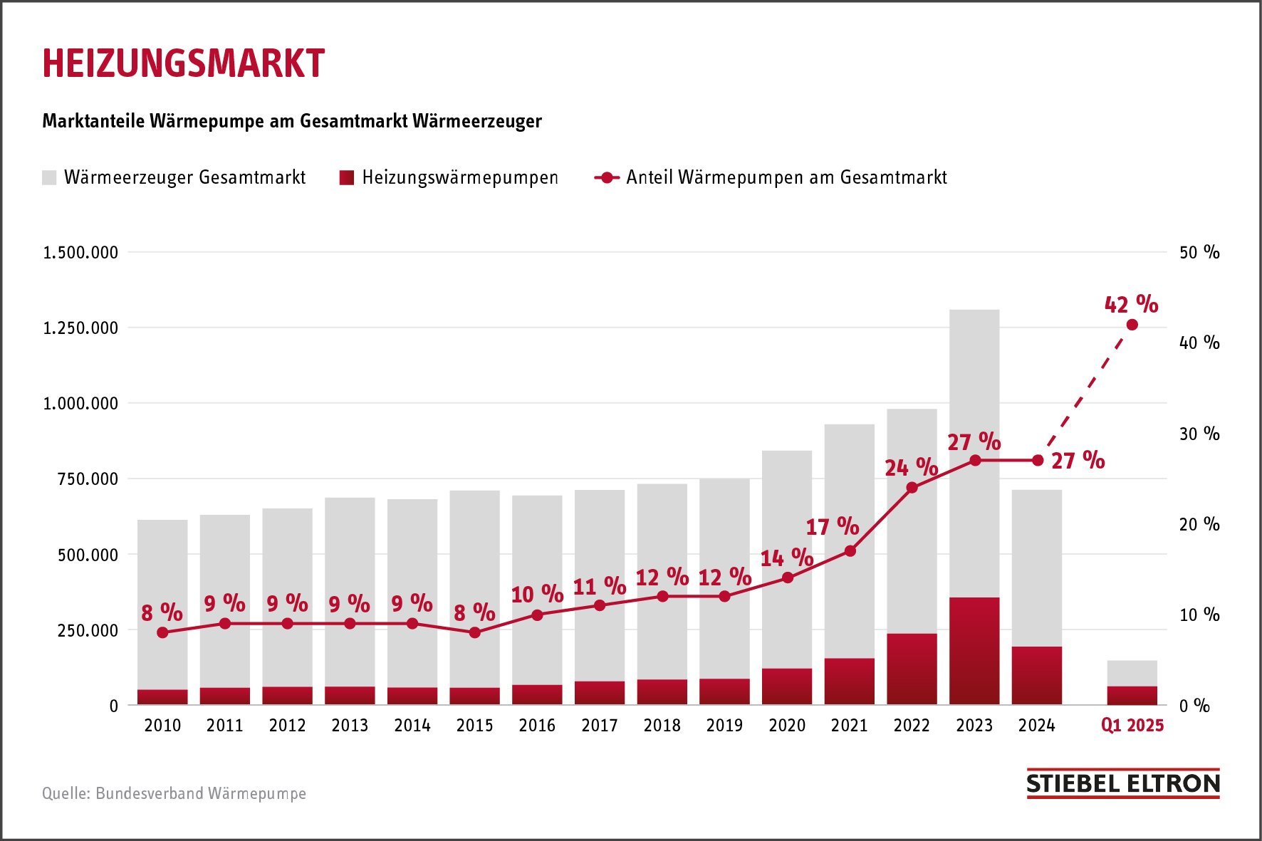 „Der 42-Prozent-Marktanteil der Wärmepumpe im Wettlauf der Wärmeerzeuger im ersten Quartal 2025 zeigt, dass die Wärmewende jetzt stattfindet. Im gesamten Jahr 2024 lag die Quote noch bei 27 Prozent, vor zehn Jahren waren es gerade mal 8 Prozent.“