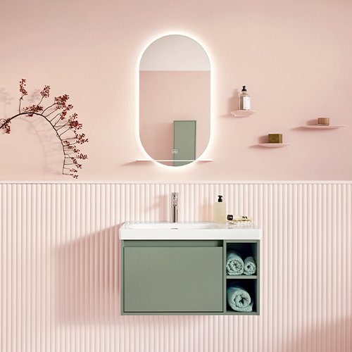 Dreh- und Angelpunkt von Skyla ist der Waschplatz: Hier treffen sich minimalistische und organische Formen, dezente Asymmetrien, clevere Stauraumlösungen und designstarke Möbelfarben. Die Waschtische verbinden geschickt unterschiedliche Formen und finden so den perfekten Mittelweg: Die klaren Außenlinien werden durch die sanfte Rundung des Waschbeckens aufgebrochen. Durch die asymmetrische Anordnung entsteht ein Effekt, der nicht nur gut aussieht, sondern auch für praktische Ablagefläche sorgt. Innenliegende Fronten und dezente Griffmulden verleihen den Badmöbeln eine klare, aufgeräumte Ästhetik, während der sanfte Übergang vom Waschtisch zum Unterschrank die ruhige Formensprache noch weiter unterstreicht. Das Ergebnis ist ein harmonisches Design, das sich mühelos in verschiedenste Wohnstile integriert – und trotzdem seinen ganz eigenen Akzent setzt.